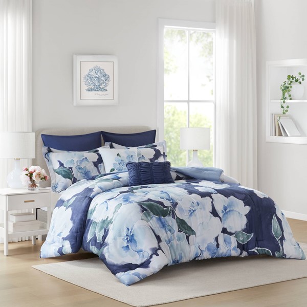 Madison Park Shanti 7pcs Printed Comforter set in Blue, Queen MP10-8920
