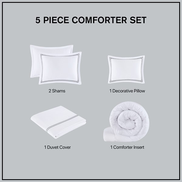 Make every night feel like a luxurious hotel escape with this 500 Thread Count comforter set. Made of soft cotton, this refined 5 piece set features a double-row striped embroidered border for an elegant finish. The duvet cover is removable and has corner ties with a zipper closure for easy care. This set is also OEKO-TEX certified, meaning it does not contain any harmful substances or chemicals to ensure quality comfort and wellness.