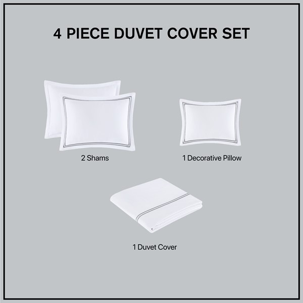 Make every night feel like a luxurious hotel escape with this 500 Thread Count duvet cover set. Made of soft cotton, this refined 4 piece set features a double-row striped embroidered border for an elegant finish. The duvet cover is removable and has corner ties with a zipper closure for easy care. This set is also OEKO-TEX certified, meaning it does not contain any harmful substances or chemicals to ensure quality comfort and wellness.
