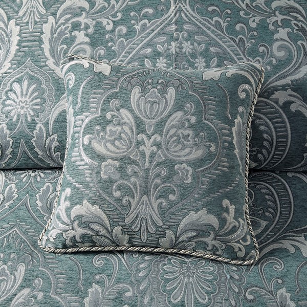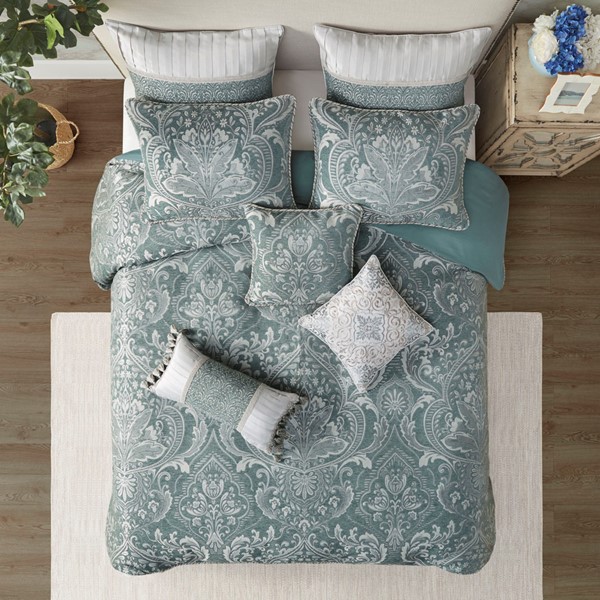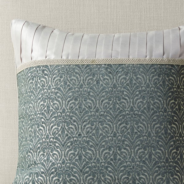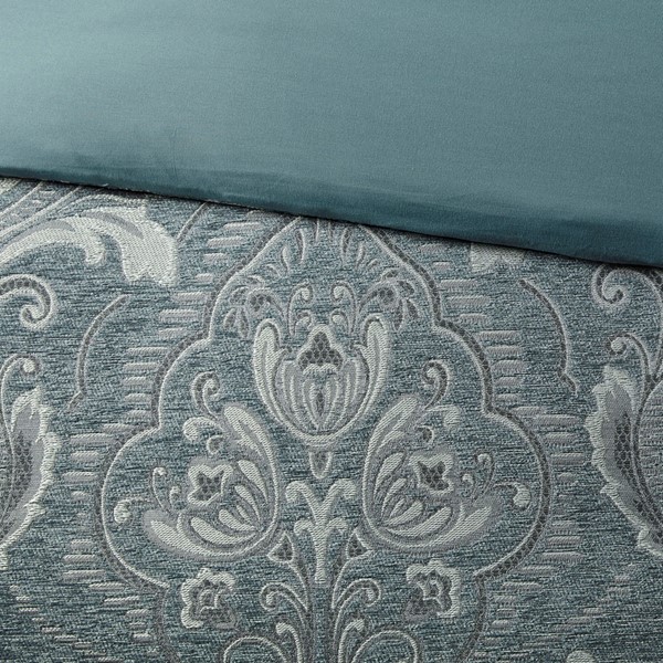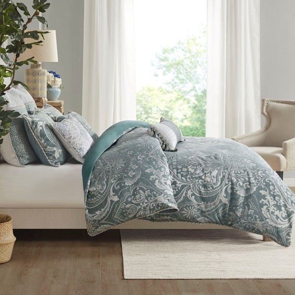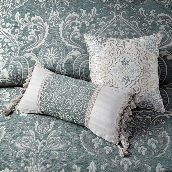 Madison Park Signature’s Adelphia 8 Piece Jacquard Comforter Set offers a stunning blend of elegance and glamour to your bedroom. This elegant comforter features a large woven damask pattern in shades of blue and silver with a braided cord trim, for a luxurious traditional look. The oversized and overfilled comforter uses a removable duvet-style insert that is secured by inner ties and a hidden button closure. This provides no visible bartacking lines on top of the bed to create a smooth, clean face. Also included are 2 matching shams and 2 Euro shams that coordinate beautifully with the luxurious comforter. Fabric manipulation and embroidered details on the oblong decorative pillow and 2 square decorative pillows provide textural finishing touches to this traditionally elegant comforter set, while their removable covers with hidden zipper closures make them easy to clean. Dry clean comforter cover only and machine wash comforter filler.