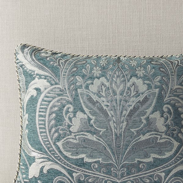* Features a large woven damask pattern in shades of blue and silver with a beautiful braided cord trim