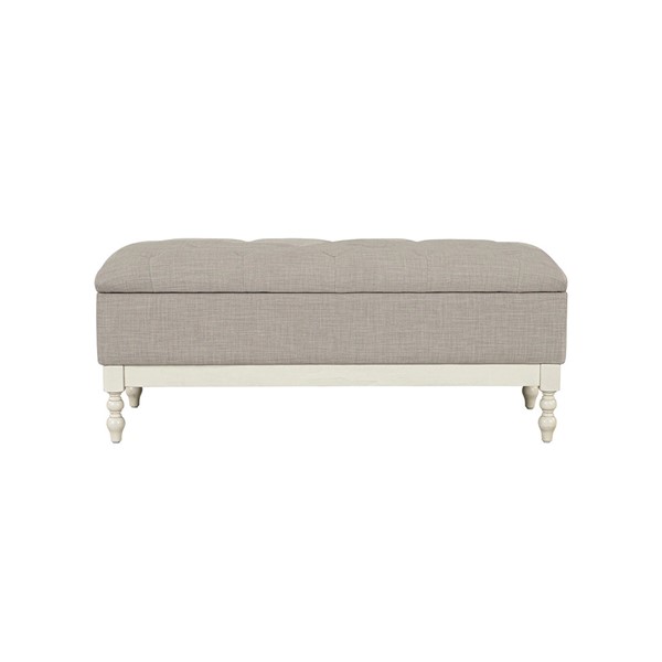 Elevate your bedroom or living room with the sophisticated charm of the Madison Park Signature Beckett Tufted Storage Bench. Adorned in light grey upholstery with a tufted top, it offers a soft textural touch to its luxurious design. The solid wood turned legs feature an antique cream finish, beautifully complementing the upholstery while exuding timeless elegance. With ample storage space for blankets or home essentials, this bench seamlessly combines functionality with style. Leg assembly is required, tool included.