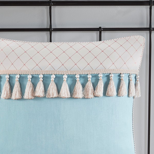 Euro sham face: 100% polyester diamond jacquard and faux silk pieced, stitched with tassel fringe; back: diamond jacquard, twist cording on four sides