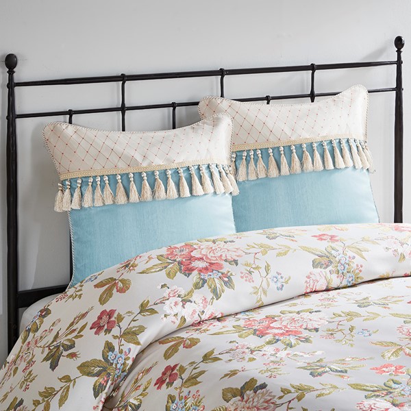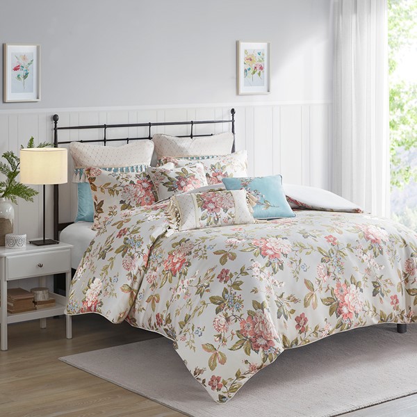 Bring traditional beauty to your bedroom with the Madison Park Signature Carolyn 9 Piece Floral Jacquard Comforter. The cottage comforter features a red, blue, green floral pattern on a soft ivory background with a braided cord trim, creating an elegant country look. The oversized and overfilled comforter uses a removable duvet-style insert that is secured by inner ties and a hidden button closure. This provides no visible bartacking lines on top of the bed to create a smooth, clean face. Also included are 2 matching shams and 3 Euro shams that coordinate beautifully with the luxurious comforter. Fabric manipulation and embroidered details on the oblong decorative pillow and 2 square decorative pillows provide textural finishing touches to this traditionally elegant comforter set, while their removable covers with hidden zipper closures make them easy to clean. Dry clean comforter cover only and machine wash comforter filler.