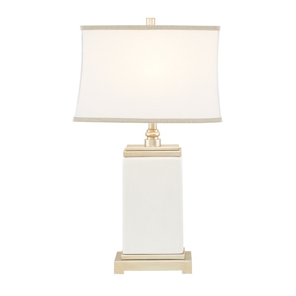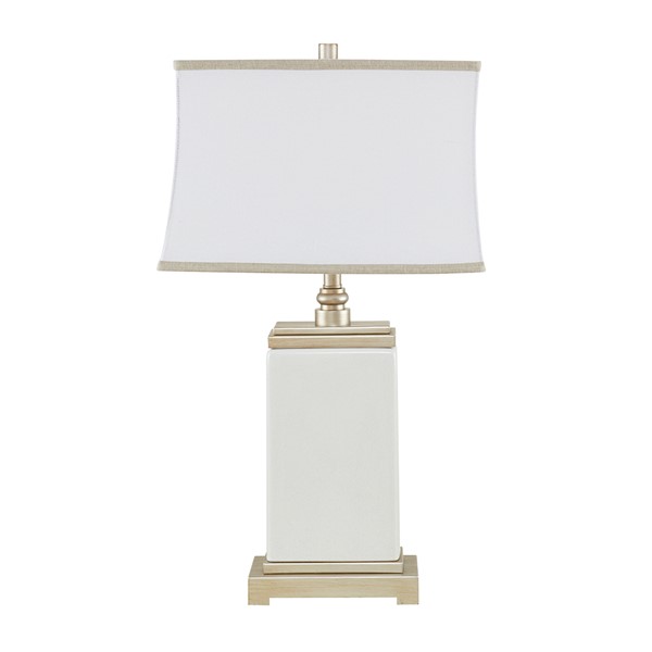 Bring a touch of elegance to any room in your home with the Hampton Hill Colette Ceramic Table Lamp. This rectangular table lamp features an ivory ceramic stand with an antique silver metal base and top to create a sophisticated transitional look. The off-white cotton shade softly filters the light into your room and is accented with a grey trim to complement the design. No assembly required.