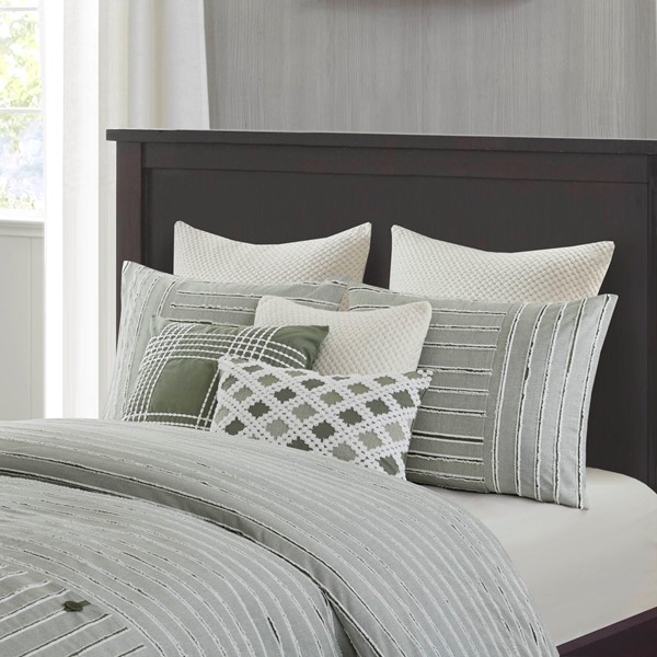 Madison Park Signature Essence Oversized Cotton Clipped Jacquard Comforter Set with Euro Shams and Throw Pillows in Green, King MPS10-552