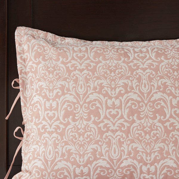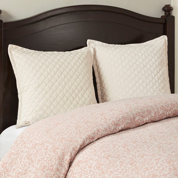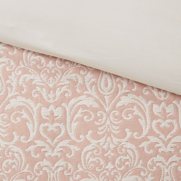 * Feature allover white chenille damask pattern on blush background