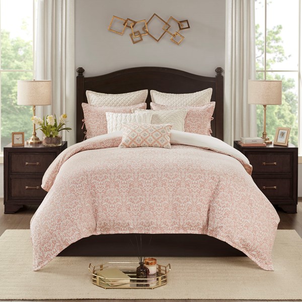 The Madison Park Signature Haven Chenille Jacquard Comforter Set introduces a subtle modern update to your bedroom. This luxurious jacquard comforter features an allover white chenille damask pattern on blush background to create a rich and elegant look. Two matching shams pair perfectly with the comforter, while two quilted Euro shams complement the contemporary design. Also included are two square and an oblong decorative pillow featuring quilted, embroidery or pleated details that add the finishing touches to this luxurious comforter set. The removable comforter filler is machine washable, but the comforter is dry clean only.
