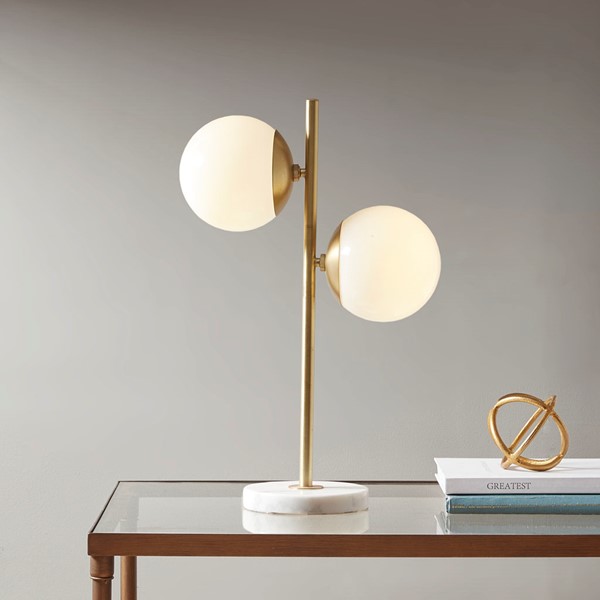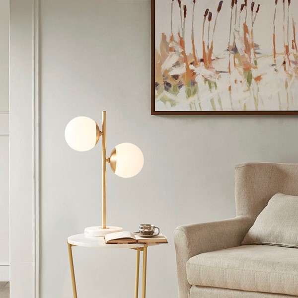 Update your space with the unique style of the INK+IVY Holloway Marble Base Table Lamp. This table lamp features a white glass shade and a metal fixture with a gold finish for a striking contrast. The rounded shape creates a truly modern look for your living room or bedroom. Two Type A light bulbs are needed.