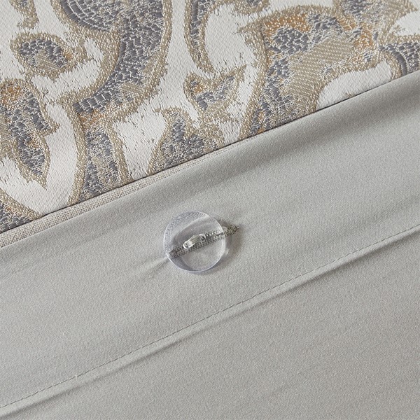 Introduce a luxurious allure to your bedroom with the Madison Park Signature Manor King 9 Piece Comforter Set. The comforter flaunts a shiny metallic damask jacquard weave, creating an elegant and textural modern look. A heavyweight comforter insert is secured inside the comforter with 4 inner ties and button closure and is removable for easy care. This provides no visible bartacking lines on top of the bed to create a smooth, clean face. Matching shams coordinate perfectly with the comforter, while coordinating Euro shams complete the contemporary bedding set. Also included are three decorative pillows that add the finishing touches to the comforter set. Simply stunning, this oversized and overfilled comforter set offers a gorgeous combination of luxurious style and comfort to elevate your bedroom decor. Dry clean comforter cover only and machine wash comforter filler.
