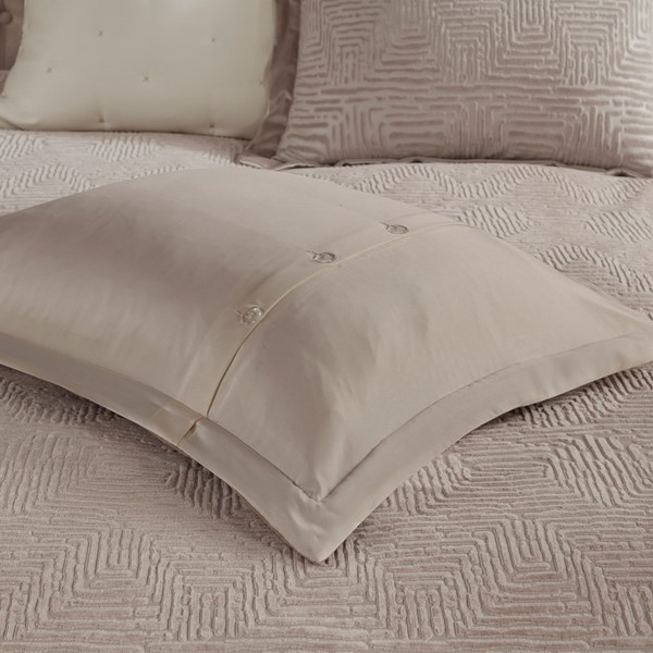 The Madison Park Signature Pescal duvet-style comforter features a burnout velvet design for a glam and luxurious look and feel. The bedding set includes 2 matching shams and 2 Euro shams (3 in King size) that layers beautifully with the comforter. The 3 decorative pillows comes with removable covers for easy care, and hidden zipper closures for a seamless look. This bedding set includes a removable overfilled insert that is secured by inner ties and hidden button closures. The hypoallergenic polyester filling in the removable insert contains no allergens and is treated to be dustproof for a comfortable sleep. In addition, is Oeko-Tex certified, meaning it does not contain any harmful substances or chemicals to ensure quality comfort and wellness. Dry clean for comforter cover and machine wash for inserts.
