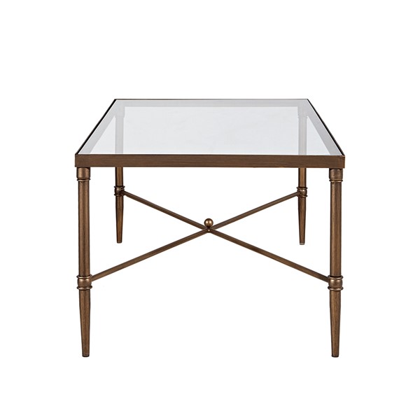 The sturdy bronze metal finished frame and tempered glass top makes this table the center of attention. Assembly required.