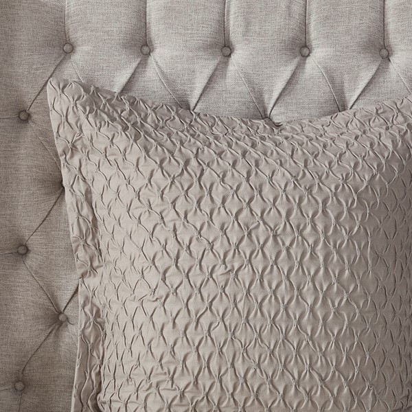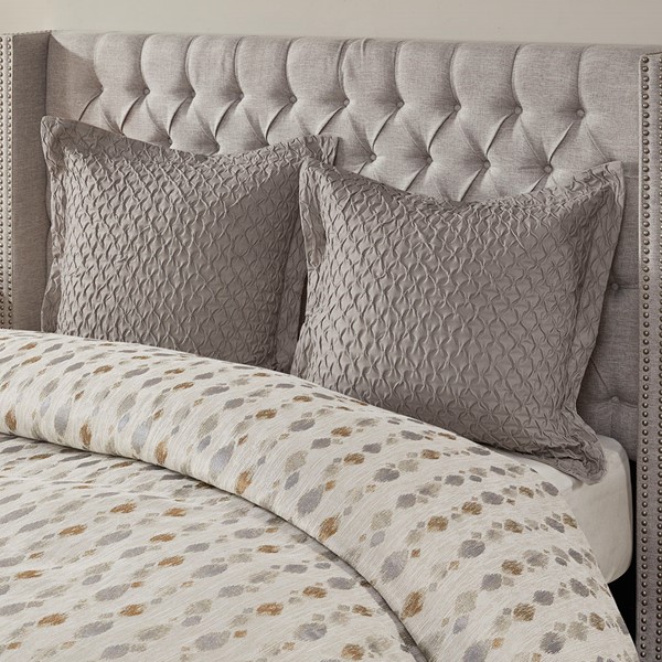 The Madison Park Signature Sanctuary King 9 Piece Comforter set offers a luxurious update to your bedroom decor. The oversized and overfilled jacquard comforter features all-over symmetric diamond shapes, in ivory, taupe, gold and silver, with slubbed yarns that create a rich texture and modern look. A heavyweight comforter insert is secured inside the comforter with 4 inner ties and a button closure and is removable for easy care. Two matching shams pair beautifully with the comforter, while coordinating euro shams complete the top of the bed. Also included are 2 square decorative pillows and 1 oblong decorative pillow with embroidered details that provide the finishing touches to this jacquard comforter set. Hypoallergenic polyester filling in the comforter insert and the decorative pillows offers exceptional warmth and comfort. Add beauty and grace to your bedroom by incorporating this jacquard comforter set into your decor. Dry clean comforter cover only and machine wash comforter filler.