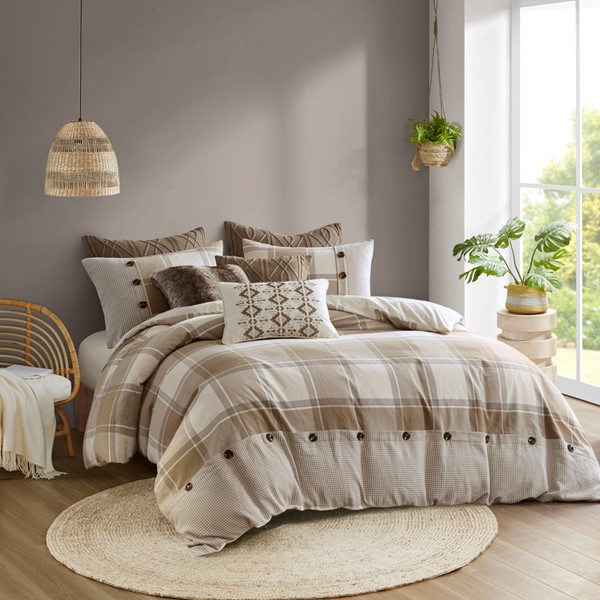 Elevate your bedroom with the cozy look of our Madison Park Signature Urban Cabin 9 Piece Comforter Set. This cotton jacquard bed showcases a beautiful plaid design that perfectly embodies casual farmhouse style. This set includes 1 comforter, 2 shams 2 (or 3 for King size) euro shams, 2 square, and 1 oblong decorative pillow. The pattern near the bottom of the comforter with button details adds a charming touch to comforter. The three decorative pillows come with removable covers that can be easily cared for and feature hidden zipper closures for a seamless aesthetic. Included in this bedding set is an overfilled insert which is firmly held in place by inner ties and concealed button closures. Filled with hypoallergenic polyester, the insert is free from allergens and has been treated to ensure it is dustproof, providing you with a comfortable sleep. For maintenance, we recommend dry cleaning the comforter cover and machine washing the inserts, ensuring your bedding remains fresh and inviting for years to come.