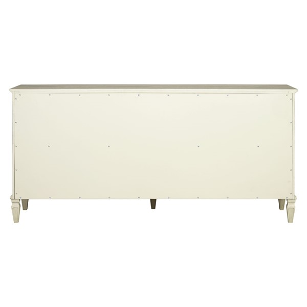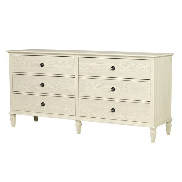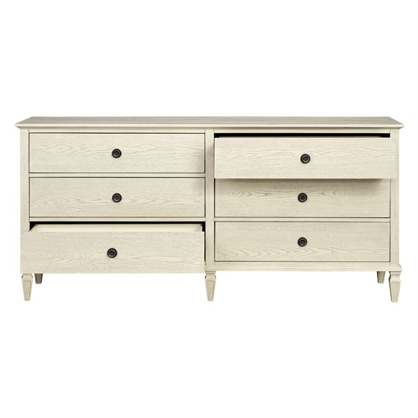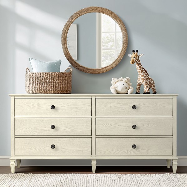 Madison Park Signature Victoria dresser blends modern classic style with molding details, turned legs, and antique-finished wood with metal drawer knobs. The finish highlights the natural wood grain texture, giving it a warm, inviting look. Its 70″ width offers ample storage with six drawers (29.75″W x 13.25″D x 5.25″H) that glide smoothly on metal ball-bearing glides with dovetail joinery. Solid wood legs with plastic glides protect floors, while an adjustable center support adds stability. Includes an anti-tip kit for safety. Easy to assemble with 6″ clearance for robotic vacuums. Perfect for bedrooms, nurseries, hallways and more –add timeless elegance to your space today!
