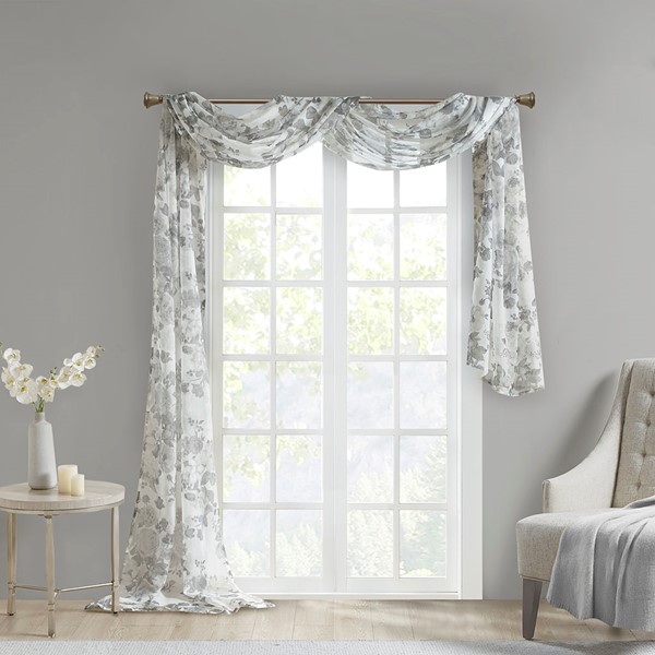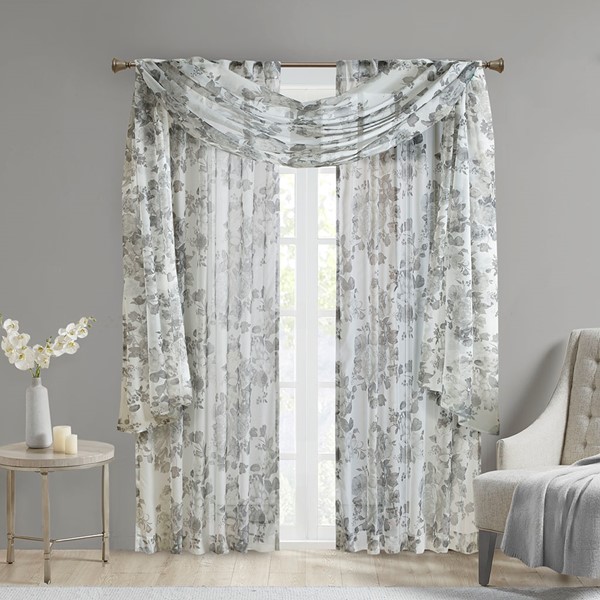 The Madison Park Simone Printed Floral Voile Sheer Scarf adds a soft and romantic touch to your home decor. This voile sheer scarf features a beautiful neutral printed floral on a white ground for a rich and stylish contrast, while the lightweight fabric adds a delicate and airy touch. Also included are four tabs with button closures that provide an easy way to drape it across your window curtain rod, for an elegant finishing touch. Machine washable for easy care, this voile sheer scarf can be layer with coordinating matching window panel or any other solid panel for a chic custom look.