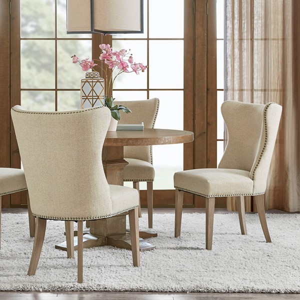 The Madison Park Skylar Dining Side Chair Set introduces a simple elegance to your dining space. Available in a set of two, these dining side chairs feature curved wing backs upholstered in a rich cream fabric with a dark pewter nail head trim along the base, for a transitional look. A light wood finish on the solid wood legs beautifully complements the upholstery. With clean lines and graceful curves, this dining side chair set adds a sophisticated touch to your dining space. Leg assembly is required.