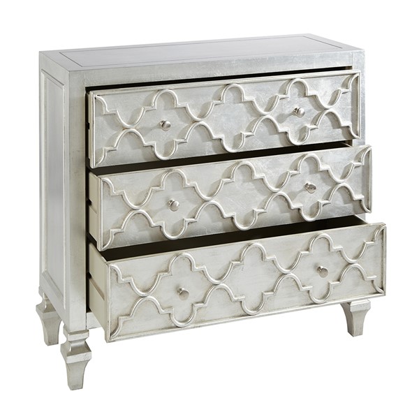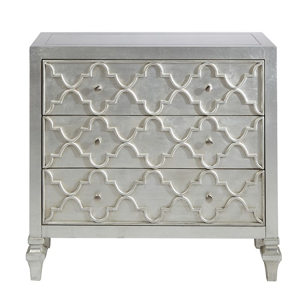 The Madison Park Somerset 3-Drawer Chest offers a stunning update to your home decor. This accent chest flaunts a faux silver leaf finish for a luxurious look. The three drawers open up to ample storage space and feature an ogee design on the fronts that add an elegant touch to the design. Place this 3-drawer accent chest in your hallway or living room to store your essentials and elevate the look of your decor. Leg assembly required.