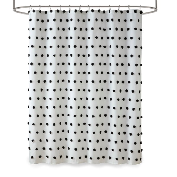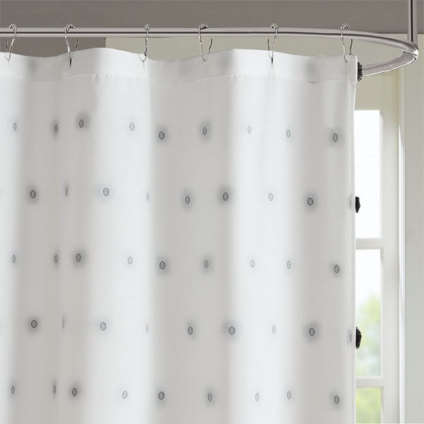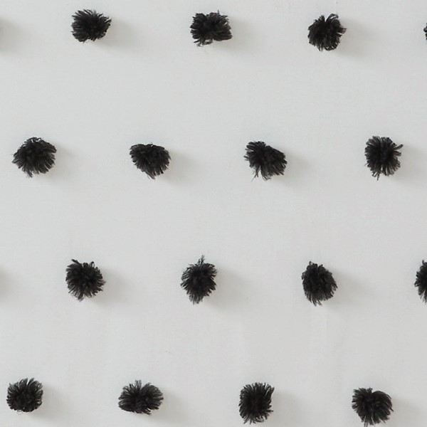 Add a fun update to your space with the Madison Park Sophie shower curtain. The solid white background features rows of soft black fabric pom poms, adding beautiful texture and a stylish update to any bathroom. Machine Washable for easy care; Each shower curtain measure 72″x72″ and is finished with 12 button holes at the top making it easy to hang; hooks, rod, and a water repellant liner are not included and will need to be purchased separately.