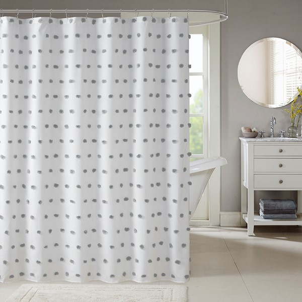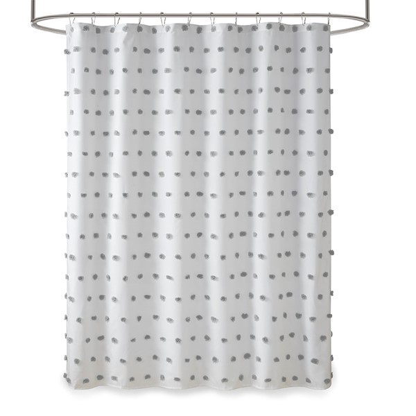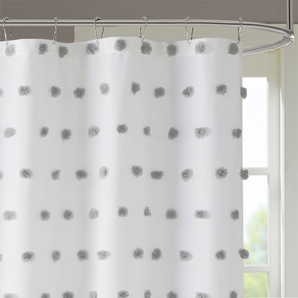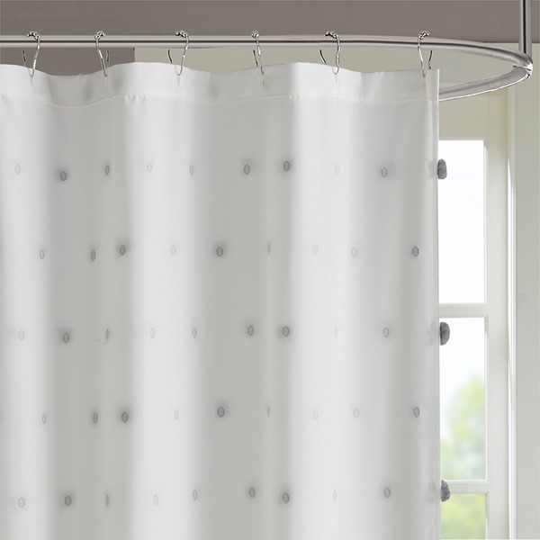Add a fun update to your space with the Madison Park Sophie shower curtain. The solid white background features rows of soft grey fabric pom poms, adding beautiful texture and a stylish update to any bathroom. Machine Washable for easy care; Each shower curtain measure 72″x72″ and is finished with 12 button holes at the top making it easy to hang; hooks, rod, and a water repellant liner are not included and will need to be purchased separately.