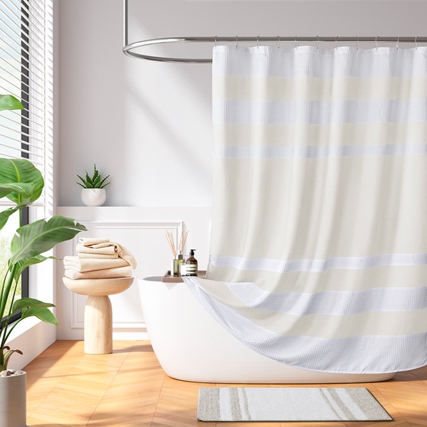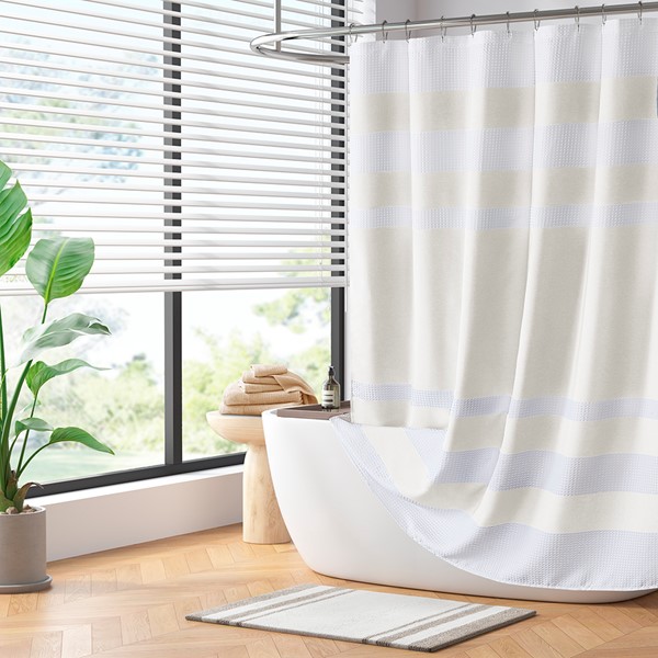 Update your space with the Madison Park Spa Waffle Shower Curtain with 3M Treatment. Featuring a fresh and updated stripe design, this shower curtain is made of a light heathered colored fabric pieced with a white waffle weave base creating a beautiful texture for the perfect spa touch to your decor. A temporary 3M Scotchgard water repellent treatment keeps your curtain looking newer, longer and is active for multiple washes. A waterproof liner is not included but still highly recommended to keep this shower curtain in its best condition; Hooks and Rod also not included and should be purchased separately. Various colors and sizes are available to fit any bathroom space. Size shown in image is standard 72×72″, stripe design may vary per all other sizes. Complete the collection with coordinate Spa Waffle Bath Towel and Spa Cotton Bath Rug, available and sold separately.
