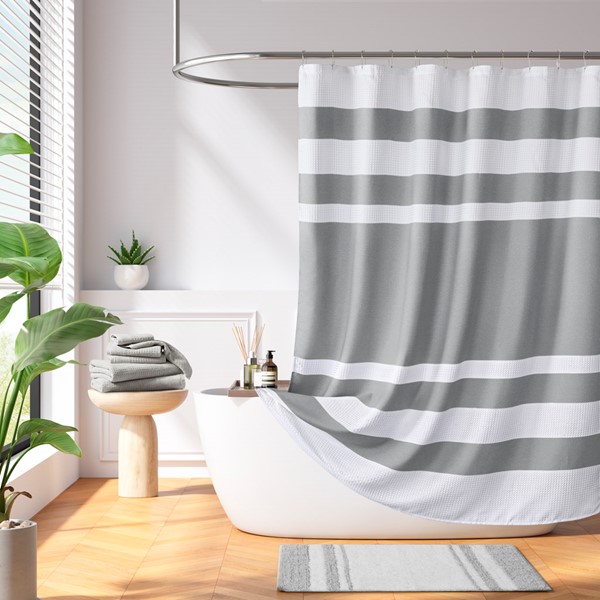 Update your space with the Madison Park Spa Waffle Shower Curtain with 3M Treatment. Featuring a fresh and updated stripe design, this shower curtain is made of a light heathered colored fabric pieced with a white waffle weave base creating a beautiful texture for the perfect spa touch to your decor. A temporary 3M Scotchgard water repellent treatment keeps your curtain looking newer, longer and is active for multiple washes. A waterproof liner is not included but still highly recommended to keep this shower curtain in its best condition; Hooks and Rod also not included and should be purchased separately. Various colors and sizes are available to fit any bathroom space. Size shown in image is standard 72×72″, stripe design may vary per all other sizes. Complete the collection with coordinate Spa Waffle Bath Towel and Spa Cotton Bath Rug, available and sold separately.