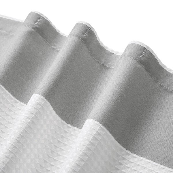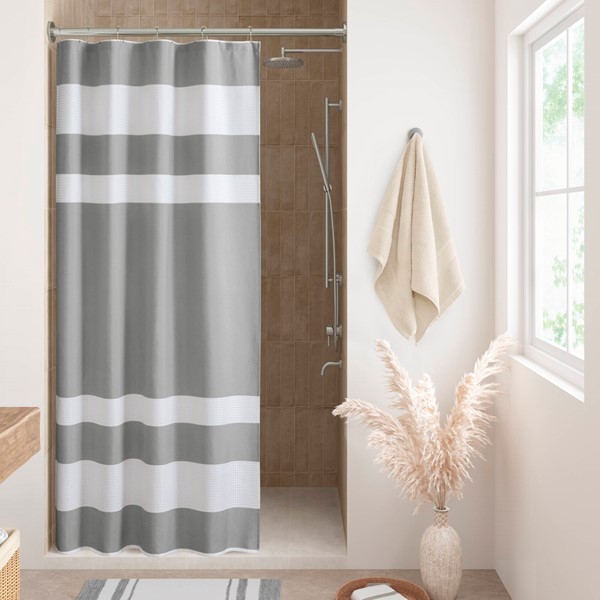 Update your space with the Madison Park Spa Waffle Shower Curtain with 3M Treatment. Featuring a fresh and updated stripe design, this shower curtain is made of a light heathered colored fabric pieced with a white waffle weave base creating a beautiful texture for the perfect spa touch to your decor. A temporary 3M Scotchgard water repellent treatment keeps your curtain looking newer, longer and is active for multiple washes. A waterproof liner is not included but still highly recommended to keep this shower curtain in its best condition; Hooks and Rod also not included and should be purchased separately. Various colors and sizes are available to fit any bathroom space. Size shown in image is standard 72×72″, stripe design may vary per all other sizes. Complete the collection with coordinate Spa Waffle Bath Towel and Spa Cotton Bath Rug, available and sold separately.