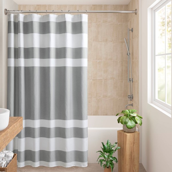 Update your space with the Madison Park Spa Waffle Shower Curtain with 3M Treatment. Featuring a fresh and updated stripe design, this shower curtain is made of a light heathered colored fabric pieced with a white waffle weave base creating a beautiful texture for the perfect spa touch to your decor. A temporary 3M Scotchgard water repellent treatment keeps your curtain looking newer, longer and is active for multiple washes. A waterproof liner is not included but still highly recommended to keep this shower curtain in its best condition; Hooks and Rod also not included and should be purchased separately. Various colors and sizes are available to fit any bathroom space. Size shown in image is standard 72×72″, stripe design may vary per all other sizes. Complete the collection with coordinate Spa Waffle Bath Towel and Spa Cotton Bath Rug, available and sold separately.