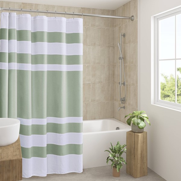 Update your space with the Madison Park Spa Waffle Shower Curtain with 3M Treatment. Featuring a fresh and updated stripe design, this shower curtain is made of a light heathered colored fabric pieced with a white waffle weave base creating a beautiful texture for the perfect spa touch to your decor. A temporary 3M Scotchgard water repellent treatment keeps your curtain looking newer, longer and is active for multiple washes. A waterproof liner is not included but still highly recommended to keep this shower curtain in its best condition; Hooks and Rod also not included and should be purchased separately. Various colors and sizes are available to fit any bathroom space. Size shown in image is standard 72×72″, stripe design may vary per all other sizes. Complete the collection with coordinate Spa Waffle Bath Towel and Spa Cotton Bath Rug, available and sold separately.