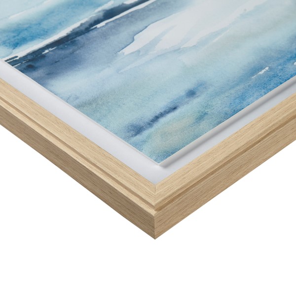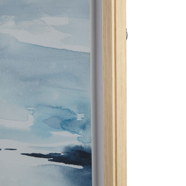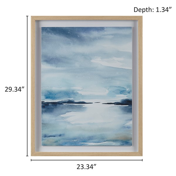 Enhance your space with this abstract landscape coastal art wall decor. Measuring 23.34" W x 29.34"H x 1.34"D, this serene piece features blue and white tones, evoking a calming ambiance. The poly frame with subtle wood texture embossing adds depth, while the glass and single matted frame create a sophisticated finish. Hang it vertically using the D-ring hangers for an instant uplift. Designed by Studio Rofino, this framed artwork is perfect for indoor use only. Transform your walls with Madison Park’s coastal art.