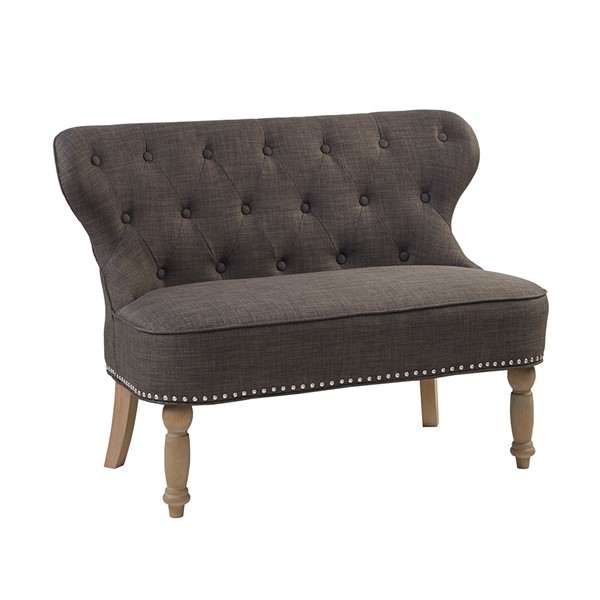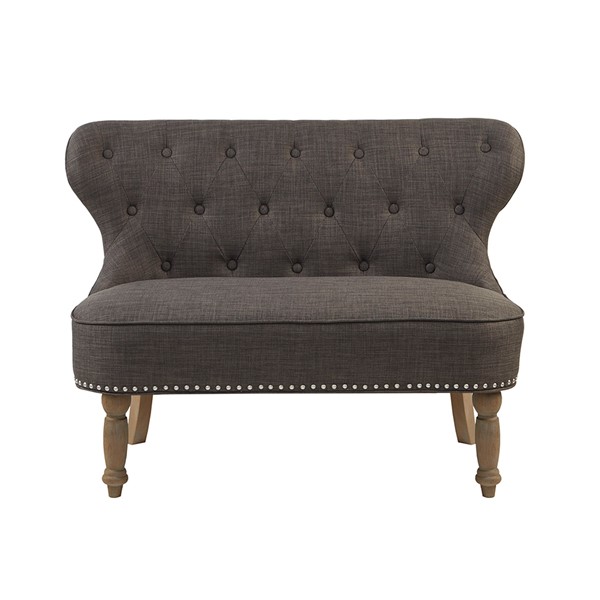 Elevate your living room decor with the sophisticated style of the Madison Park Stanford Settee. Featuring an elegant button-tufted back, this settee is upholstered in a charcoal fabric with a pewter nailhead trim for a chic transitional look. Solid wood legs provide a sturdy base and perfectly complement the upholstery. Add a unique and eye-catching style to your home by incorporating this settee into your living space. Leg assembly required.