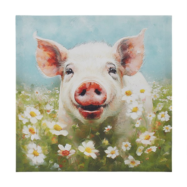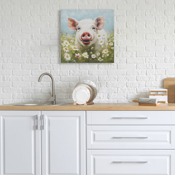 Bring a touch of whimsy to your interiors with Tessa Kane’s 16"W x 16"H happy pig wall art decor. This joyous canvas features a radiant pig blissfully dancing in flower fields, instantly sparking joy. Create a farmhouse decor with multiple pieces of farm animal canvas by Madison Park. Ready to hang with a sawtooth which ensures a quick and easy installation. For indoor use only. Infuse charm and happiness into your home with this captivating art decor for your dining room, kitchen, or living room.
