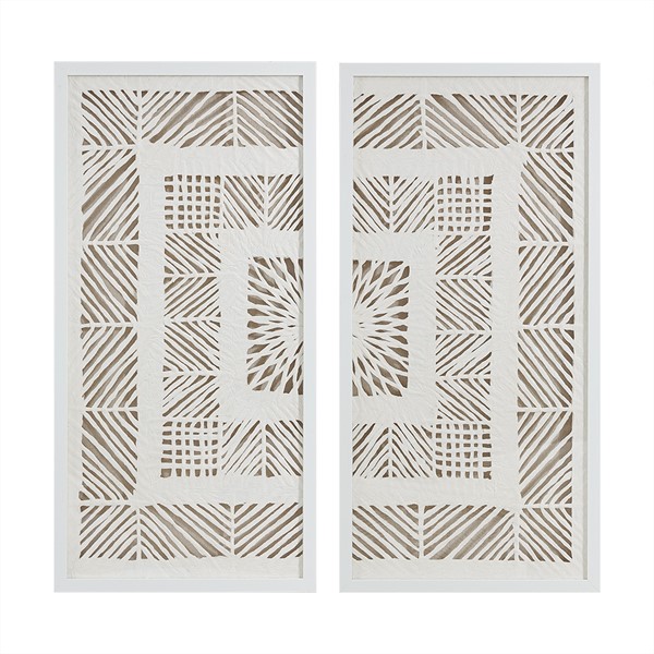 Elevate your home decor with our Madison Park Tala Framed Rice Paper Shadow Box 2 Piece Set. This shadow box set features a geometric design made from natural rice paper material, creating the perfect update of a soft global touch with a modern flair. Casted under glass and finished with a neutral frame provides a soft touch and rich dimension sure to draw anyone’s eye with its organic beauty. 2 D-rings are finished on the reverse of each piece making this set easy to hang; simply hang side by side intimately along with other decor for a gallery look or add some space in between for a more focus piece to fill any wall space.