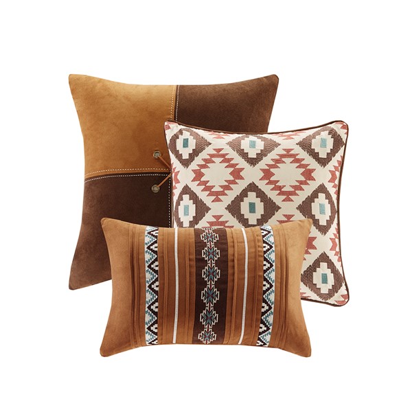 Create a warm, lodge look in your space with the Madison Park Taos 6 Piece Reversible Quilt Set. This striped look features different geometric motifs in red, spice and pops of aqua for a colorful update to your space. Three decorative pillows feature piecing and embroidery for a cohesive look.