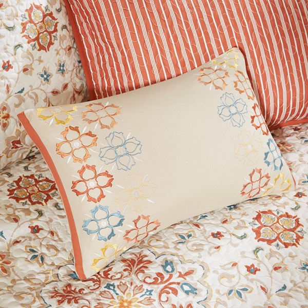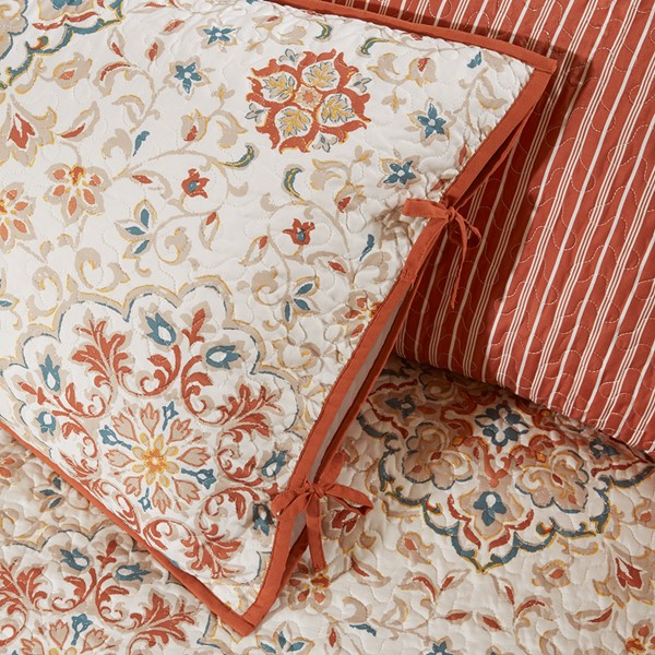 Create a warm and elegant space in your guest room with the Madison Park Tissa 6 Piece Reversible Daybed Cover Set. This quilted daybed cover features a medallion print with a striped reverse to create a chic globally-inspired look. The 3 reversible shams repeat the patterns seen on the daybed and feature tie closures on the sides, adding a delightful accent. An oblong decorative pillow with medallion embroidery and a striped bedskirt add the finishing touches to this reversible daybed set. Machine washable for easy care, this daybed cover set easily fits a Twin size mattress.