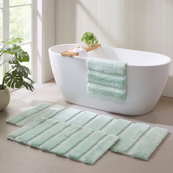 Transform your bathroom into a simple and stylish haven with our Madison Park Tufted Pearl Channel Rug. This solid tufted bath rug features a high-low stripe design with a light sheen and luster that adds rich dimension and texture for the perfect shabby chic touch your bathroom decor. Constructed from 100% macro-spun polyester fibers, each tufted bath rug is also durable for long-lasting, incredibly soft. Machine washable for easy care and available in a soft palette of fade and stain resistant colors, this tufted bath rug is the perfect addition to complete any bathroom decor!