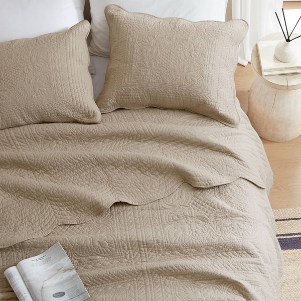 The Madison Park Tuscany 3 Piece Reversible Scalloped Edge Quilt Set is perfect as a layering piece or as an alternative to your comforter for a charming country look. The quilt and shams flaunt a classic stitch pattern with scalloped edges that add an elegant touch to your bedroom. This reversible quilt is filled with cotton filling and features a soft microfiber face, giving your bed a cozy cottage look. This farmhouse-inspired quilt also has an antimicrobial treatment that provides built-in freshness protection, reducing the growth of odor causing bacteria to keep fabric lasting longer.