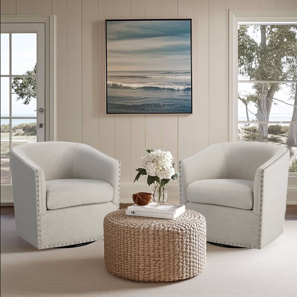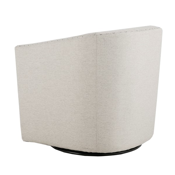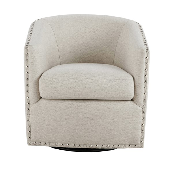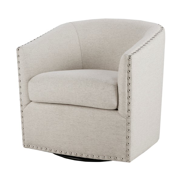 Upgrade your space with the stylish and versatile Tyler Swivel Chair from Madison Park. Featuring a 360-degree smooth swivel mechanism, this chair combines functionality and comfort for any room. The elegant barrel-back design, accented with nailheads, adds sophistication, while the thick, removable seat cushion and curved back offer lasting support. Built with high-density seat foam, sinuous springs, and a corrosion-resistant metal swivel base, it ensures durability and comfort. Fully assembled and ready to use, this chair complements various interior styles, making it a perfect addition to your living room, bedroom, home office, nursery, or entryway. Elevate your decor and bring home the Tyler Swivel Chair today!