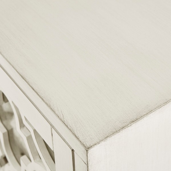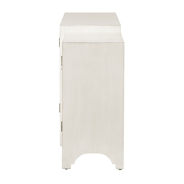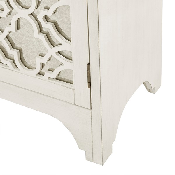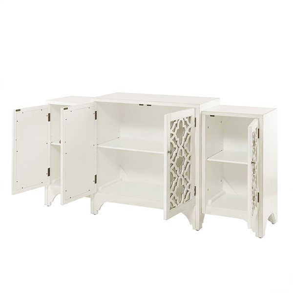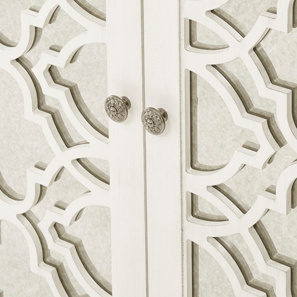 The Madison Park Verona Dining Buffet Server Quaterfoil Design Kitchen Storage Cabinet with Mirrored Doors offers an elegant and luxurious storage solution to your dining space. This kitchen buffet features four mirrored front doors with elegant wood detailing that creates a beautiful transitional look. Each door opens up to an adjustable shelf to easily store your flatware and glasses, while magnetic catches keep the doors securely closed. On the manufactured wood frame and solid wood legs, a cream wood finish adds a soft and subtle beauty to the design. Incorporate this buffet into your dining decor to give your home an eye-catching and lavish update.