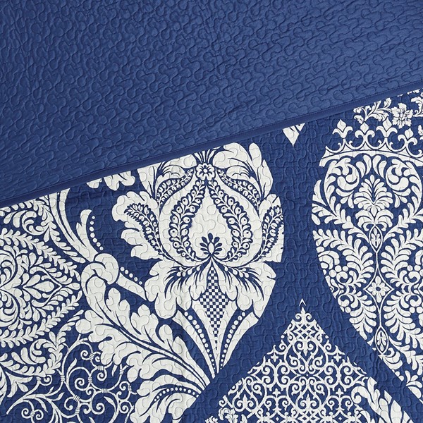 The Madison Park Vienna 6 Piece Reversible Quilt Set offers an eye-catching update to your bedroom decor. A beautifully intricate damask pattern is flaunted across the quilted quilt and shams, for a chic transitional look. The solid reverse perfectly complements the top of the bed, while the flange border adds a charming accent to the quilt. Three decorative pillows with embroidered details and fabric manipulation complete the quilt set. Made from 100% cotton sateen, this bedding set is OEKO-TEX certified, meaning it does not contain any harmful substances or chemicals to ensure quality comfort and wellness.