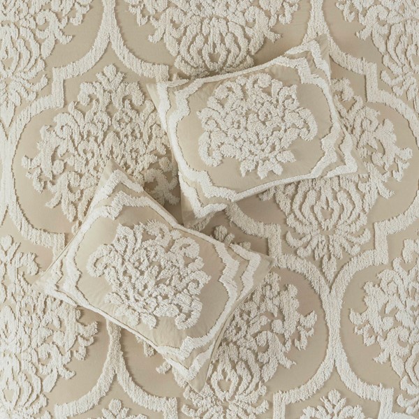 The Madison Park Viola 3 Piece Tufted Cotton Chenille Damask Duvet Cover Set offers the perfect cottage touch to your bedroom decor. A tufted chenille damask design is beautifully displayed on the 100% cotton duvet cover and matching shams, for a soft shabby chic look. Machine washable for easy care, this bedding set is OEKO-TEX certified, meaning it does not contain any harmful substances or chemicals to ensure quality comfort and wellness. A button closure secures a comforter insert within the duvet cover and inside corner ties prevent it from shifting (insert is NOT included). Due to the nature of the chenille fabric, some shedding will occur naturally in the first 3-4 washes.