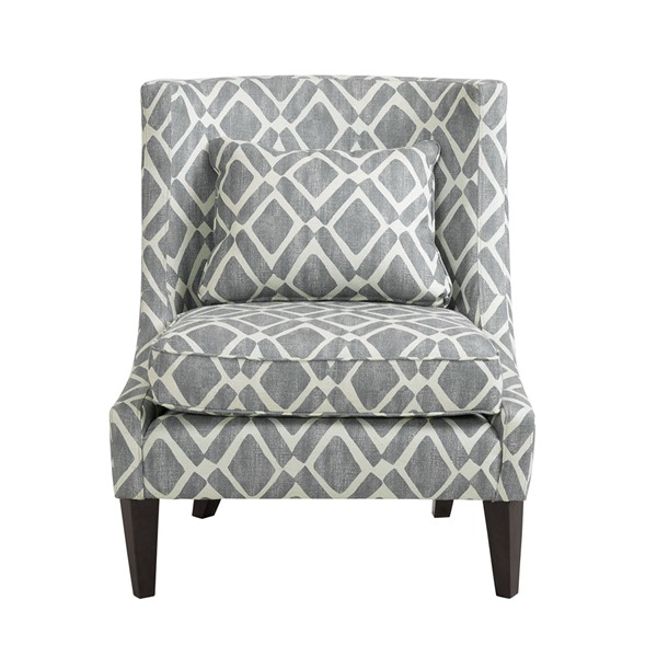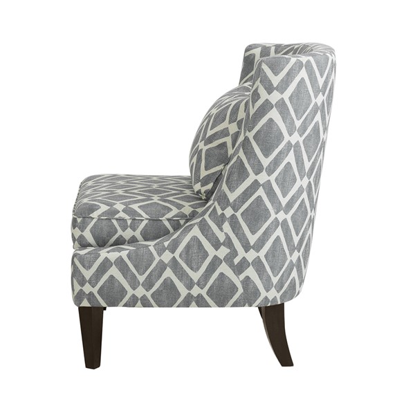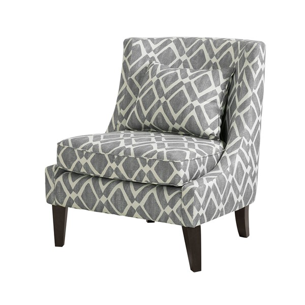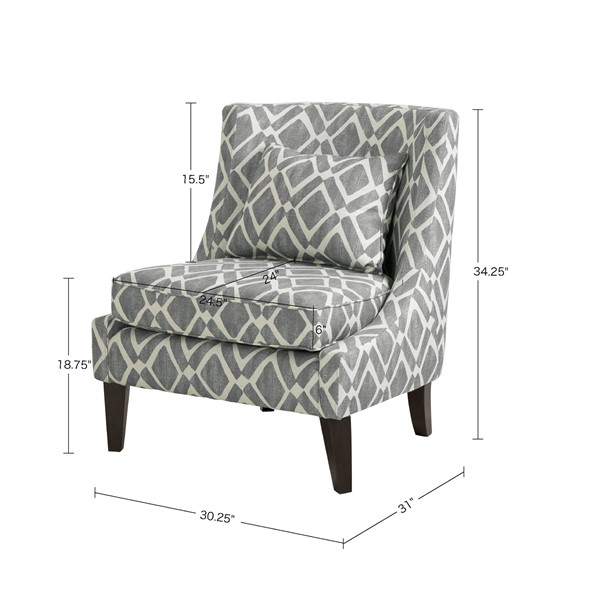 Elevate your living room decor with the chic style of the Madison Park Waverly Swoop Arm Chair. This swoop arm accent chair features a loose back and seat upholstered in grey geometric print fabric that creates a rich modern look. The solid wood legs showcase a black finish to complement the upholstery with a sophisticated contrast. With its elegant silhouette, this swoop arm chair fits in most spaces to update your home decor. Leg assembly is required.
