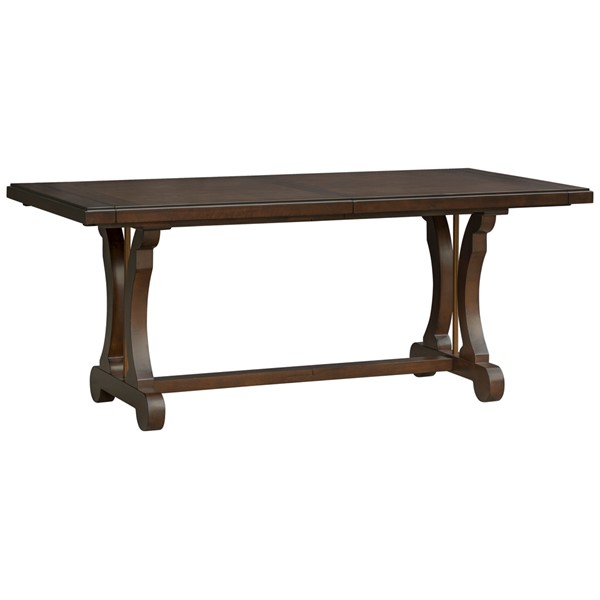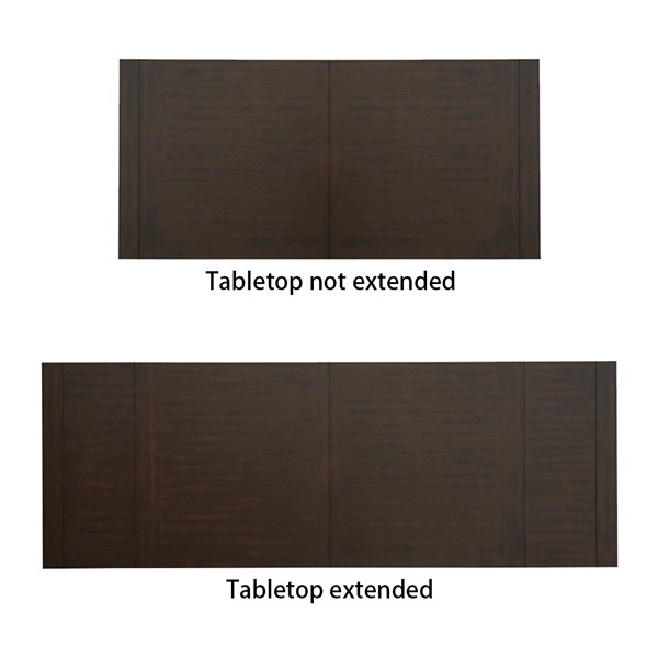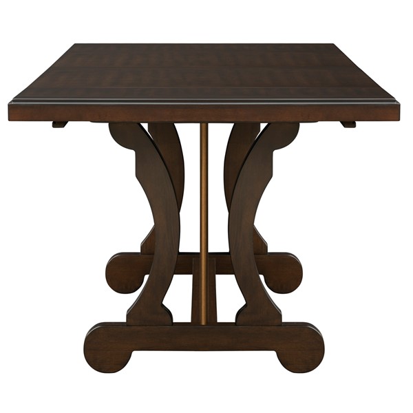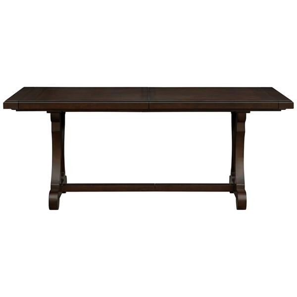 Bring your dining room and family together with the elegant traditional design of this extendable dining table. The solid wood veneer tabletop flaunts a beautiful and rich brown finish with a trestle style base to create a gorgeous refined look. Natural color variations will occur due to the nature of the wood, but that gives this kitchen table character and charm. Able to comfortably sit between 6-8 people, this wood dining table not only elevates your dining space but your dining experience too.