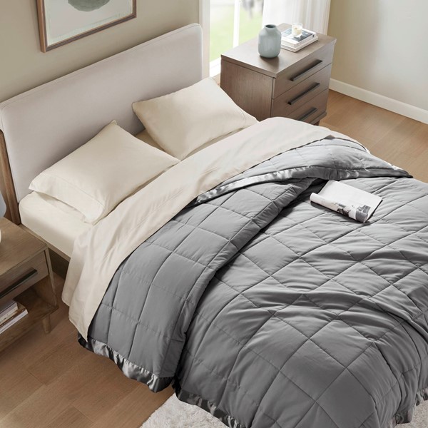I am extremely satisfied with this comforter – it is lightweight, soft, and warm. The beige color is a lovely light cafe aulait and the cover stays in place for a peaceful sleep. I highly recommend this product!