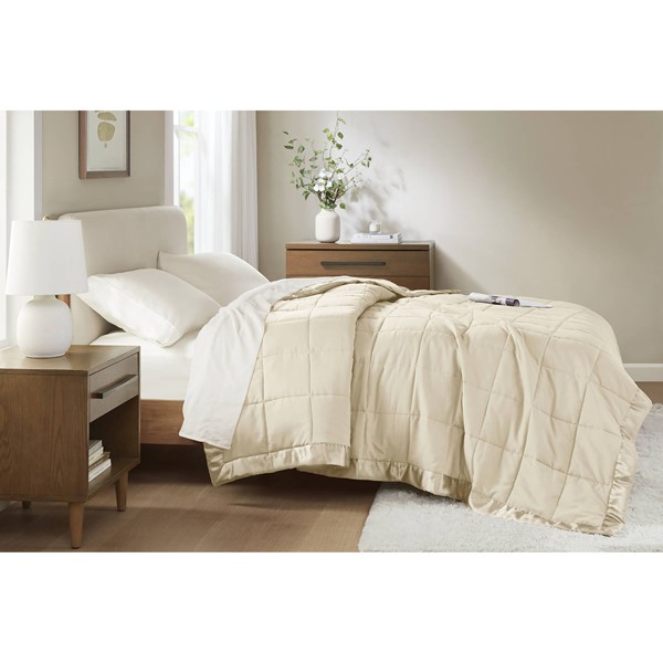 This blanket is lovely and has a great low-medium weight. It also fluffs up nicely after being dried. I bought it for my grandmother’s move to a single bed in assisted living and the retro satin edging adds a nice touch.
