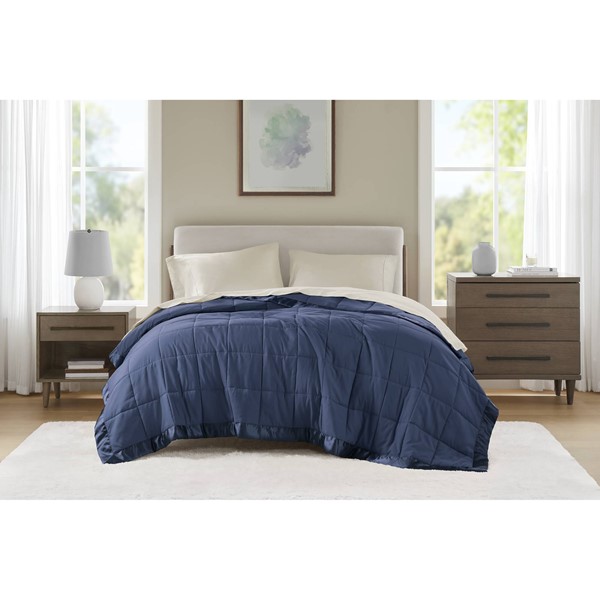 I purchased the navy version of this blanket for my Queen bed as a Spring/Summer option. For those with a California King, I suggest ordering a size up. The material is water-resistant and the color is accurately portrayed.
