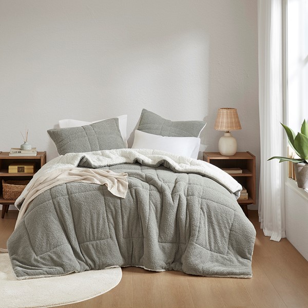 With a buttery soft face and a cozy sherpa reverse, this comforter set will make you want to stay in bed all day. The solid neutral grey tone and classic windowpane quilting make this bed match your decor easily. Its machine washable nature makes maintenance easy, and the OEKO-TEX certified material is safe on skin for durable, long lasting comfort.