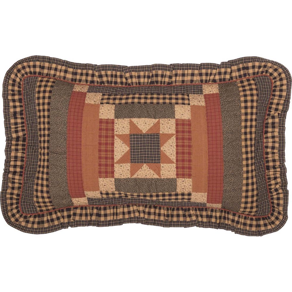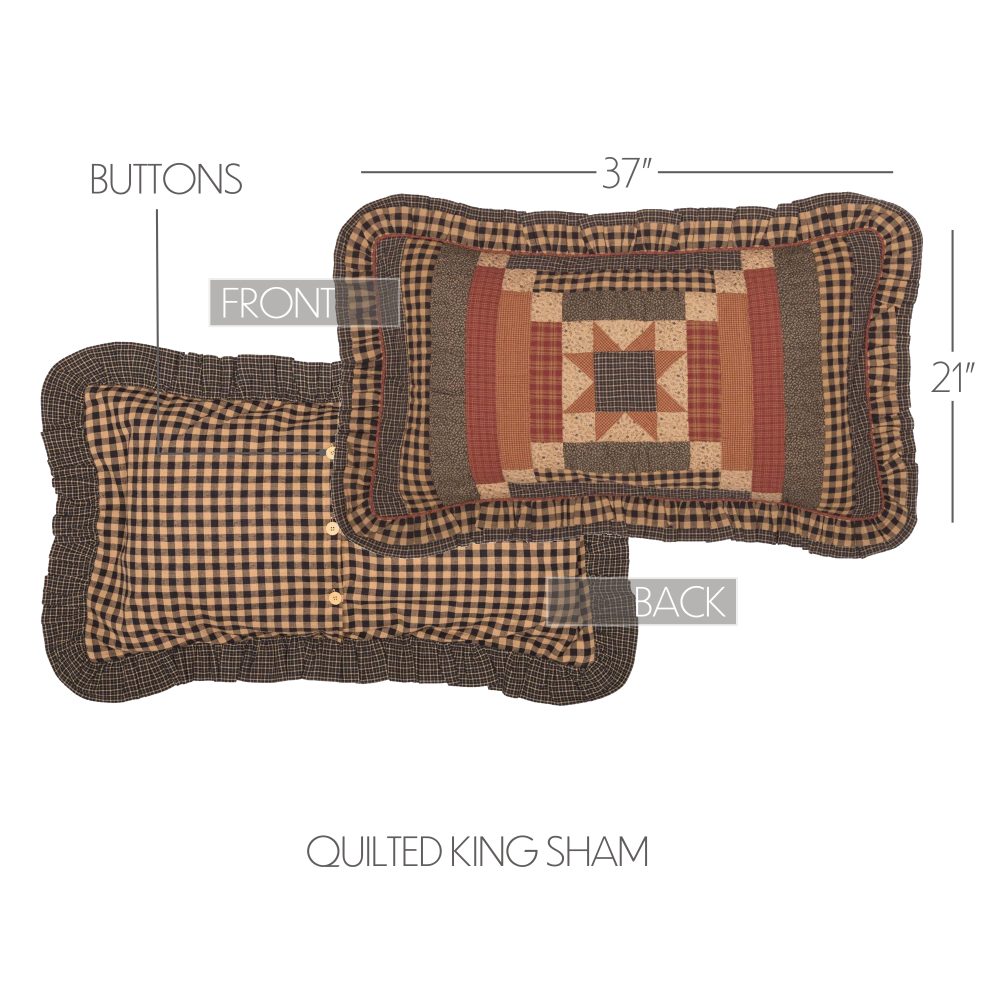 Our Maisie King Sham warms your bedroom with a barn red, golden tan, and black color scheme. This lovely color combination is arranged in a log cabin block variation called courthouse steps with an eight-pointed star in the center, bringing a historical appeal to your primitive-style bedroom. The dainty floral prints balance out the richly colored plaids in the bedding's overall design to make a gorgeous homespun tapestry. Our all-cotton 21x37 sham reverses to black and tan check with three wooden buttons.