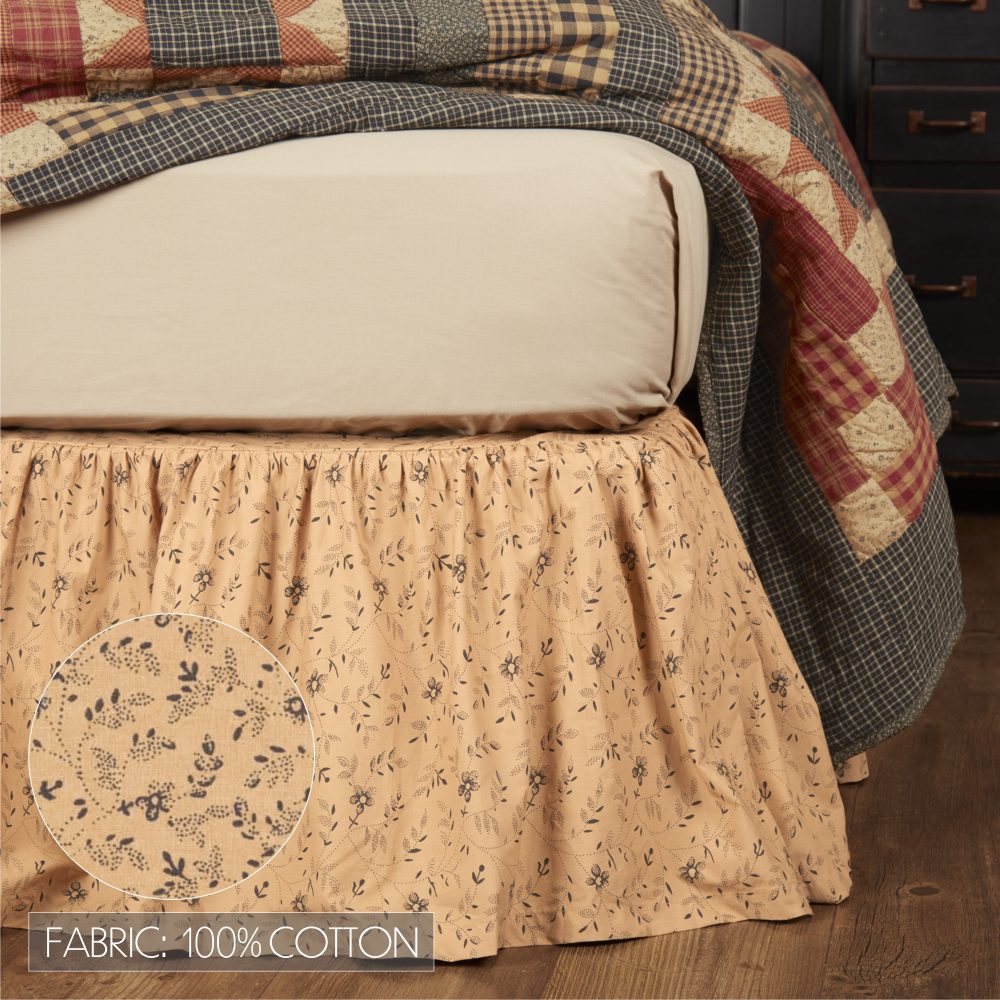 A vintage creme base with black ditsy floral provides the perfect foundation for your modern primitive bedding. The Maisie Queen Bed Skirt measures 60x80 inches and features a long 16-inch drop to ensure the skirt reaches your floor. The country style dust ruffle adds a lovely finishing touch to any room by complementing your decor while concealing under-bed storage and blocking dust accumulation in hard-to-reach areas. Made of 100 percent cotton, this traditional floral bed skirt is machine washable and iron safe. Coordinates with the Maisie Collection by VHC for vintage country style and pairs with the Maisie Quilt (sold separately) for the perfect balance of soft florals and robust log cabin blocks.