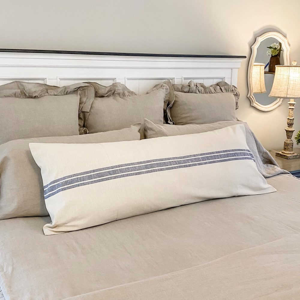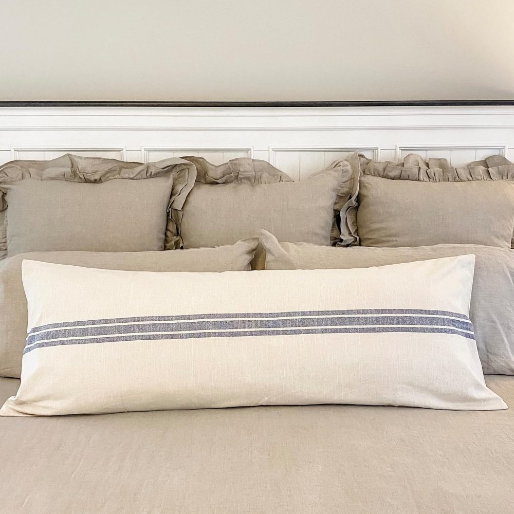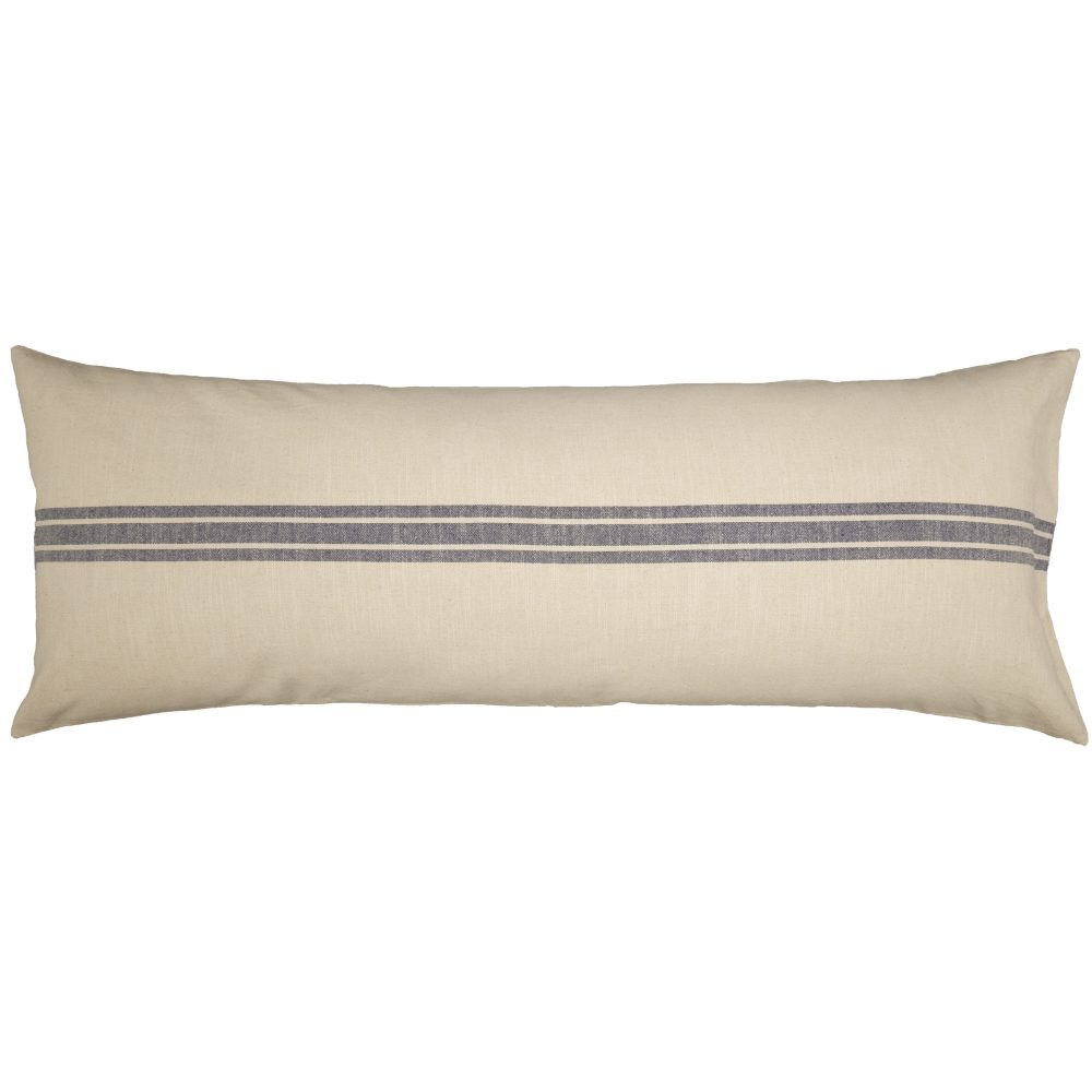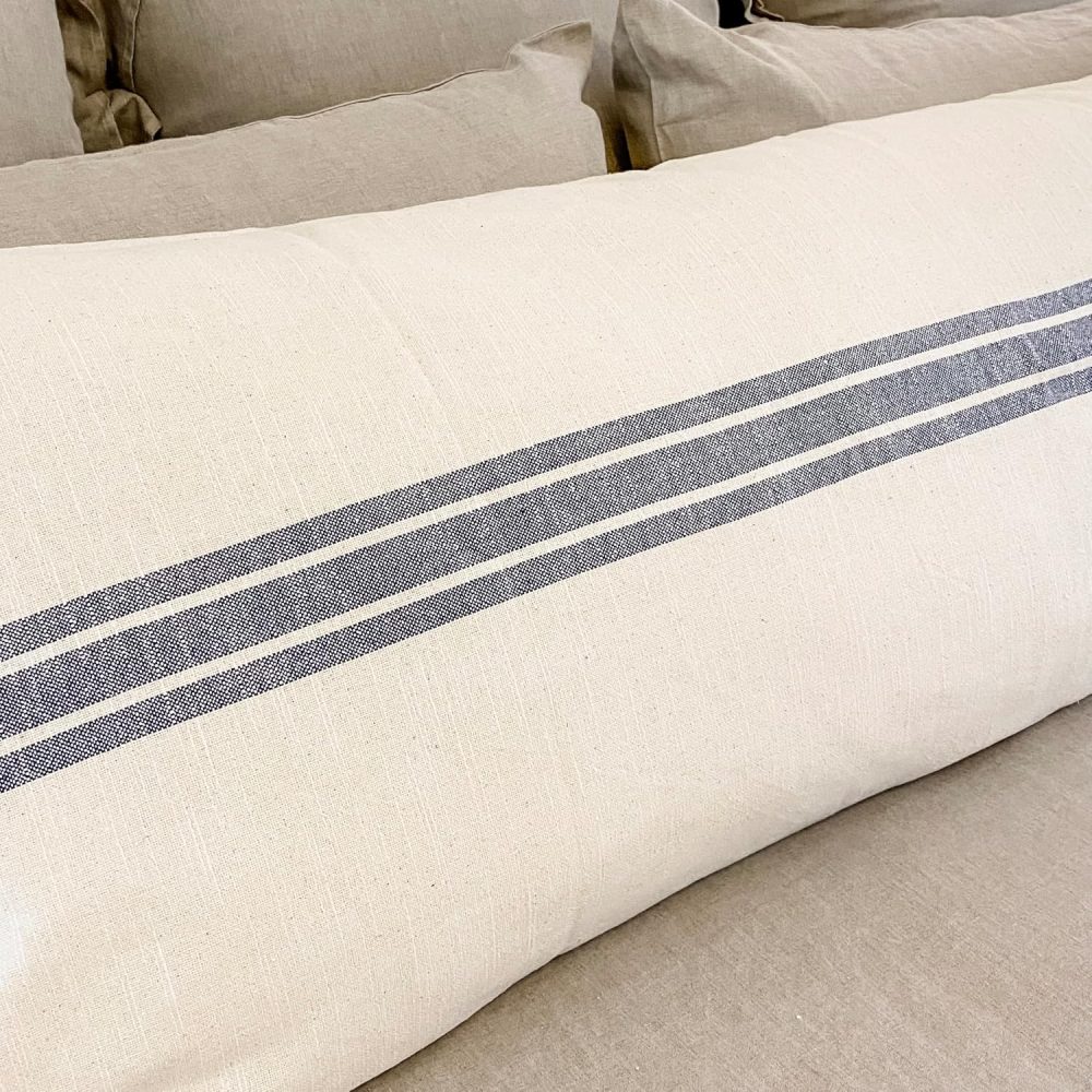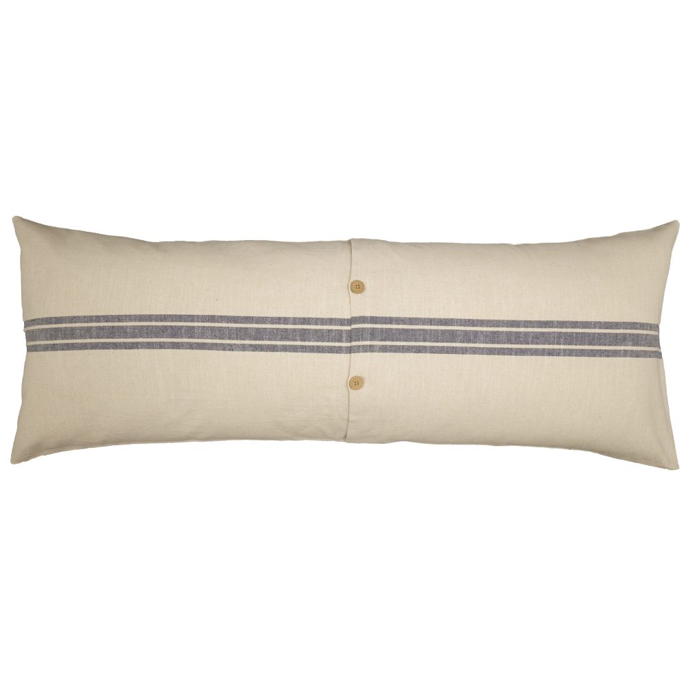 - A trio of 3-grain sack stripes in a soft blue run horizontally across the natural cream toned pillow cover. Long body pillow sham reverses to the same fabric design on the back and a 3.0 overlap of fabric at the opening offers a stable place to secure 2 natural-toned wooden buttons (1). One extra wooden button is inside the cover, just in case!